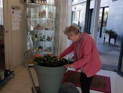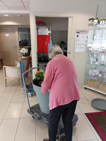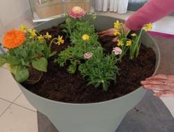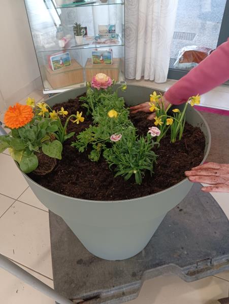 Ce beau temps donne également envie de faire du jardinage et de rafraichir les bacs de plante de l'établissement. Aussi, en ce samedi, Mme LAUNEY a mis en terre des jonquilles, arômes, dahlias, soucis et pensées... Ainsi 3 nouveaux pots de plantes sont arrivés sur la terrasse.
