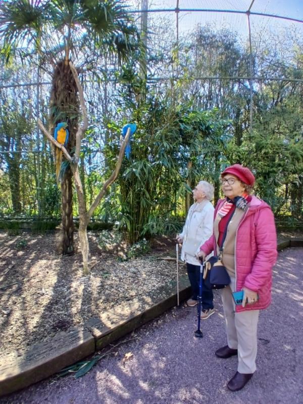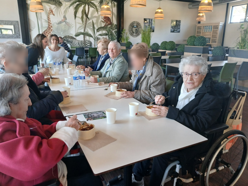 Le repas a été partagé par tous au snack du zoo. Les résidentes et leurs trois accompagnatrices en ont profité ensuite pour se promener dans le parc et découvrir les zones de vies des animaux. Les résidentes ont pu admirer les belles couleurs des flamants roses et des perroquets, observer les rayures des zèbres, les robes tachetées des girafes, et le merveilleux loup blanc.